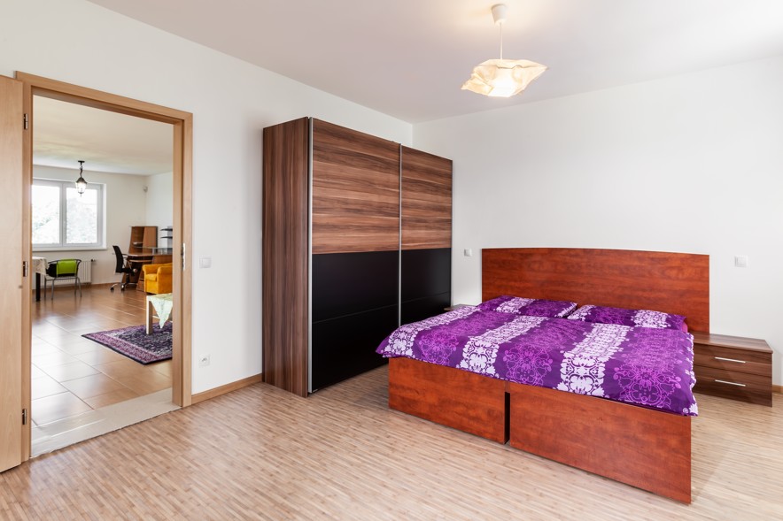 Apartman hostelu Milánská se skládá z ložnice s dvoulůžkem s možností rozdělení na jednolůžka, obyvacího pokoje s kuchyňským koutem a vstupem na terasu, předsíně a velké koupelny.